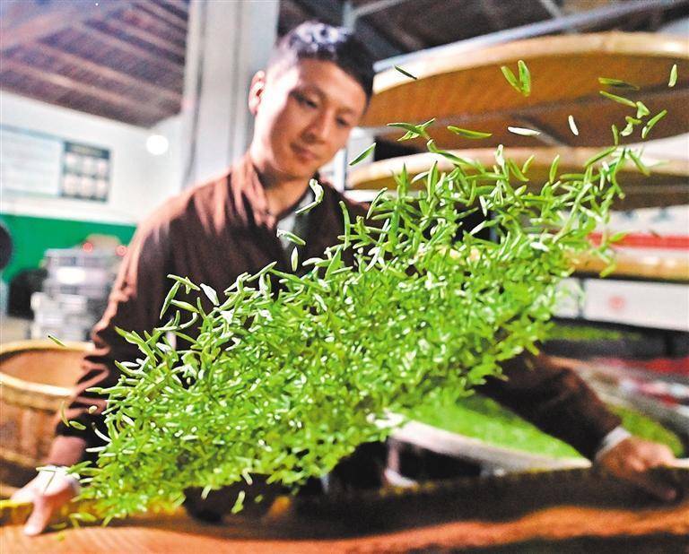 4月8日,江西上饶市婺源县大鄣山乡高山有机茶基地,工作人员正以传统摊青、杀青工艺处理高山鲜叶。
