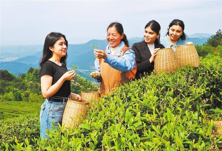 4月10日,四川达州市复兴镇板桥村茶厂,外国留学生在了解茶叶相关种植知识,感受中国茶文化魅力。