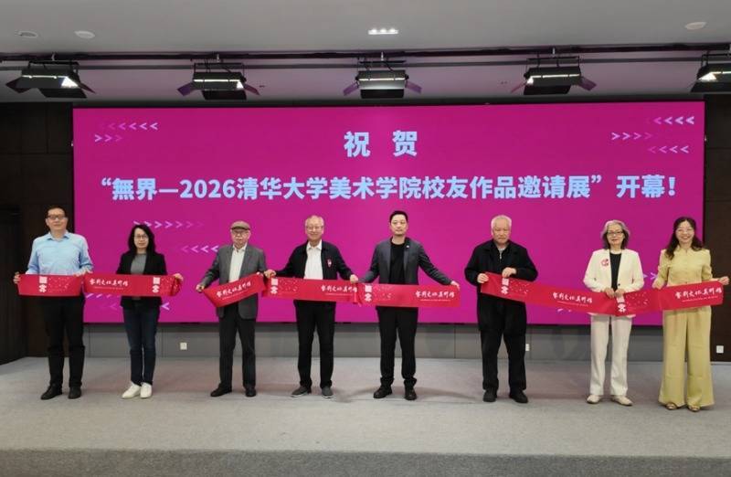 开幕式的高潮在剪彩时刻到来。在热烈的倒数声中,马文甲、赵雅娟、李天凯、朱敏、李当岐、刘巨德、杜大恺、庞媛等八位主礼嘉宾一起为展览开幕剪彩,标志着“無界——2026清华大学美术学院校友作品邀请展”正式开幕。